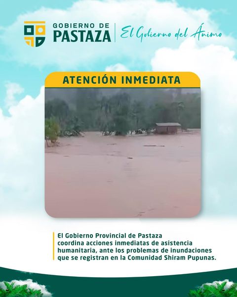 Ante los problemas que se han presentado en las últimas horas en la Comunidad Shiram Pupunas, por las constantes lluvias, el prefecto André Granda dispuso la inmediata atención humanitaria a través de la Jefatura de Gestión de Riesgo y del Patronato Provincial de Pastaza, para las familias afectadas por la creciente del río Oso – Ushilla Bobonaza.